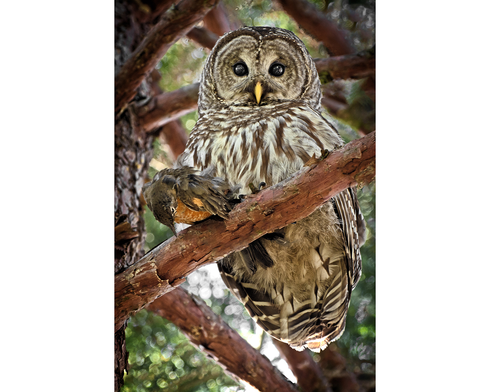 The photograph above shows a wild barred owl shortly after it nabbed a robin for lunch. More photos at MattWittPhotography.com. Also available is a book of 132 photographs, Monumental Beauty: Wonders Worth Protecting in the Cascade-Siskiyou National Monument, with all proceeds going to local profits that promote and defend public lands.